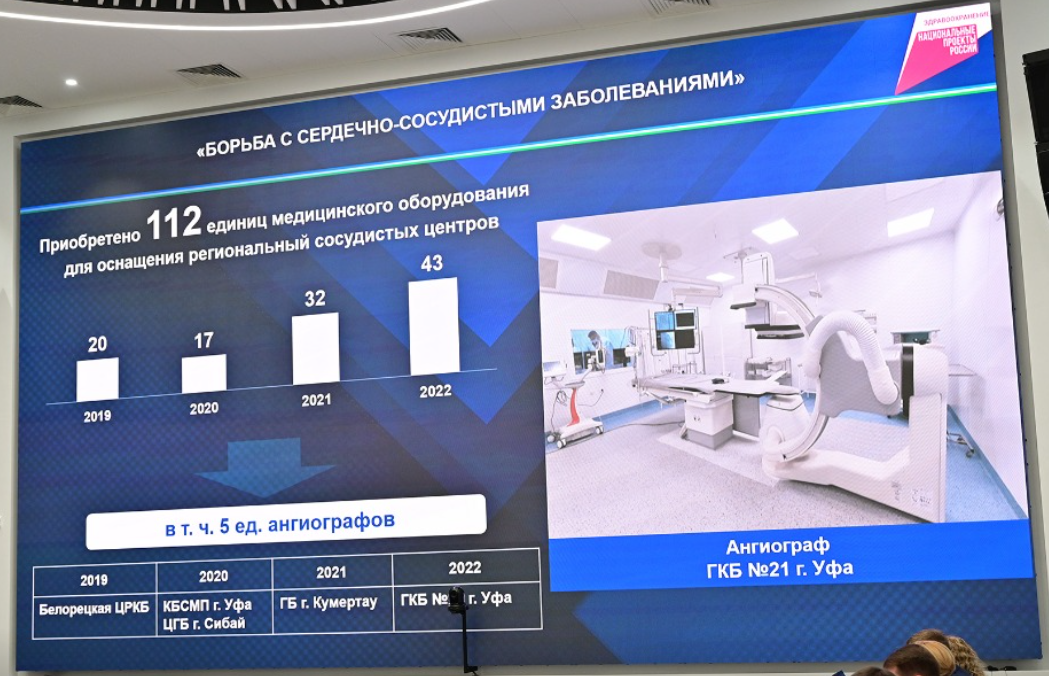 – Большое внимание уделяем укреплению материально-технической базы лечебных учреждений, – отметил Айрат Рахматуллин. – Так, за 2019–2022 годы приобрели 112 единиц медицинского оборудования, в том числе пять ангиографических установок. На 2023 год планируем установить ещё один ангиограф – в селе Месягутово Дуванского района. Благодаря этому более 94 процентов взрослого населения смогут получить экстренную высокотехнологичную медицинскую помощь при инфаркте миокарда в течение двух часов.