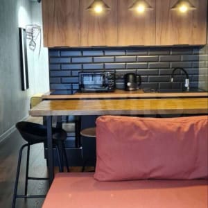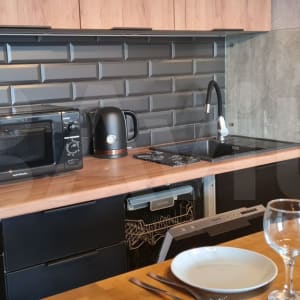 - Кухней со встроенной плитой, электрическим духовным шкафом, посудомоечной машиной, электрочайником, микроволновкой и холодильником;